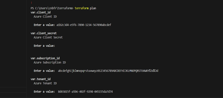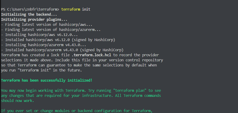 This command sets up your environment, downloads the Azure provider plugin, and initializes Terraform.