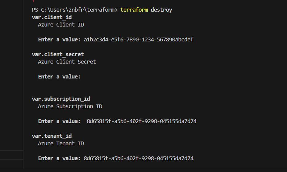Here, enter your Azure login information and configuration settings. Put absolute values in place of placeholders.